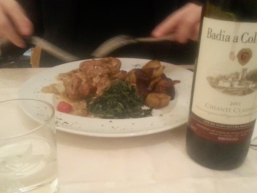 To be honest, after the many hours spent at the museum, we went back to our hotel and collapsed for a well-deserved siesta. The evening was dedicated to roaming the old, narrow streets, and at the beginning of Via del Moro, entering it from the Arno river enbamkment, there’s a wonderful, old trattoria, Da Giovanni, on the right (at number 22). This is a classic restaurant that will serve all the traditional florentine dishes like the “ribollita” (a tasty bread-based vegetable soup) to “maialino di latte” (suckling pig). We shared both the maialino and “involtini di melanzane” (eggplant rolls stuffed with meat), with an excellent Chianti, a 2011 Badia a Coltibuono: