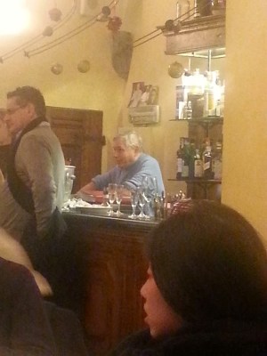 But what turned out to be most enjoyable at this place was Giovanni himself. He is short and vivacious, jumping all around his guests, looking after everyone, suggesting dishes, making sure you order the right wine. Here he is in full action behind the bar, a silver-haired elf: