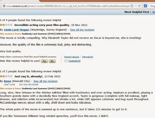 Consider this one, about Elizabeth Taylor’s performance (click here), a particularly juicy dyad of 2-star reviews; here’s the screenshot: