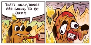 Now, in 2019, we can all agree that the “world is on fire” and that the 2010s have been a “lost decade”. Yet back in 2013, K.C. Green, a talented cartoonist could still joke about it in a stunning piece of black humor. This is the closing panel of his 6-panel piece(screenshot):
